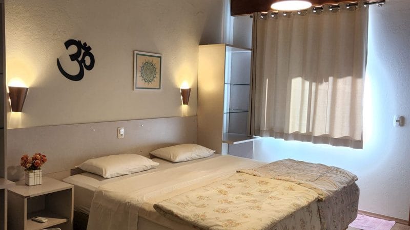 Os apartamentos são bem confortáveis, arejados e decorados e estão alocados em 4 ambientes dentro do espaço Shanti Gaia: 7 apartamentos duplo luxo na ala de hospedagem, 2 apartamentos duplo luxo na casa principal, 3 apartamentos triplos na ala do Spa e 1 chalé externo.