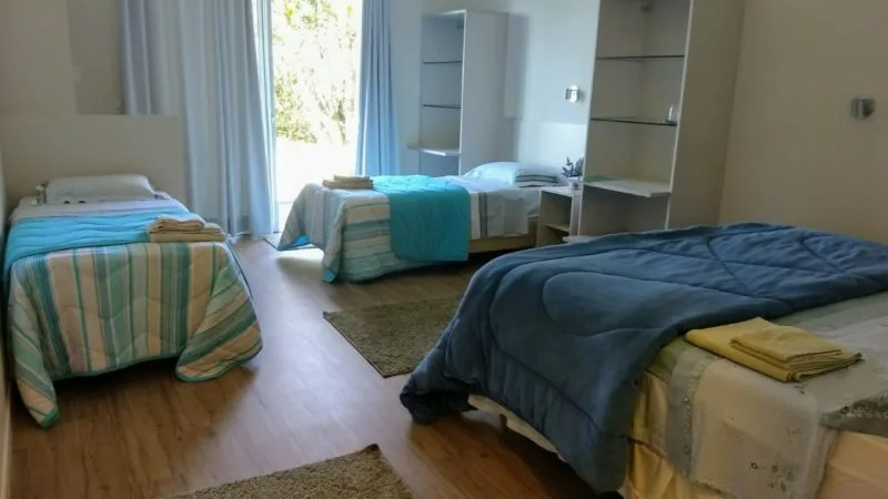 Apartamento com três camas de solteiro, banheiro privativo espaçoso, box blindex, ducha com aquecimento solar e água da fonte natural e filtrada, wi-fi livre, piso de cerâmica.